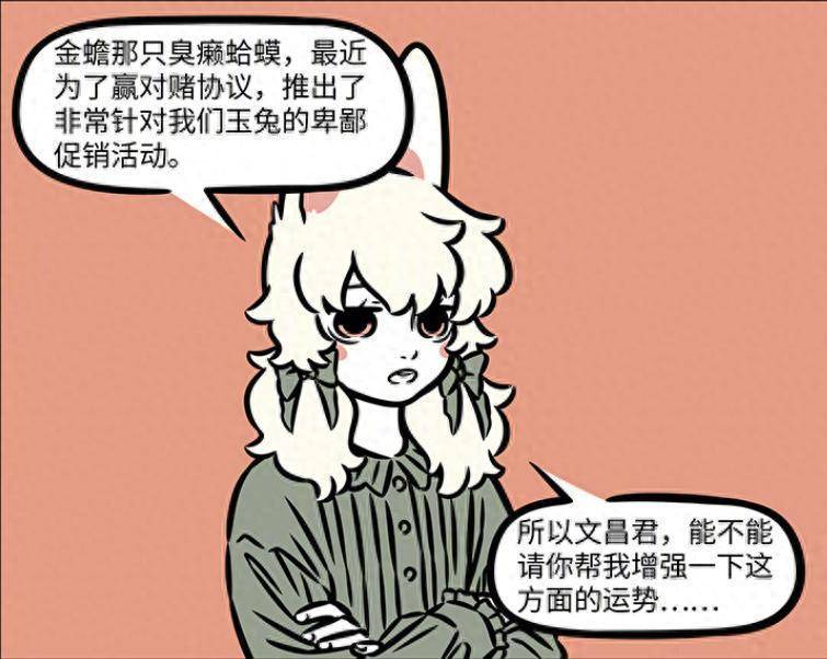 这天小玉找上文昌帝君,她表示近段时间金蟾为了赢对赌协议,推出了十分针对他们玉兔的促销活动,对此小玉自然不可能坐视不管,因此主动找上文昌帝君,希望他可以帮忙,稍微增强一下自己在这方面的运势,以此来克制金蟾,确保金蟾不在本次对赌协议中获胜。