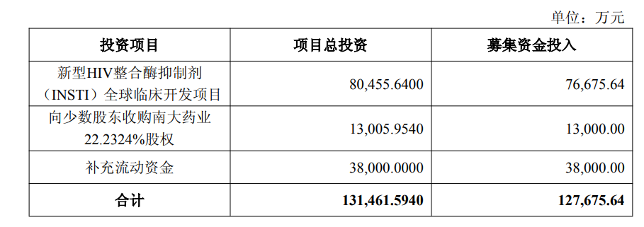公告显示,此次募集资金将全部聚焦核心业务,投向三大方向,其中7.67亿元计划投向新型HIV整合酶抑制剂(INSTI)全球临床开发项目、1.3亿元向少数股东收购南大药业22.2324%股权,以及3.8亿元补充流动资金。