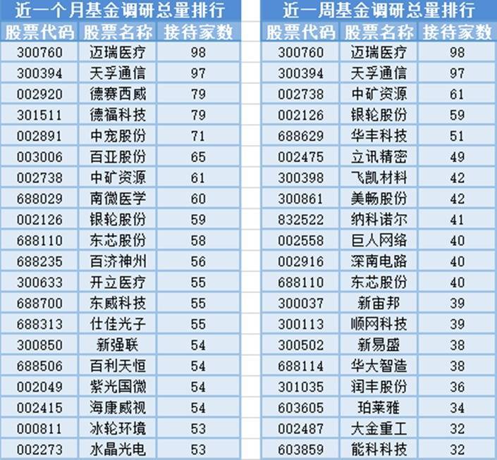 将时间周期缩短到最近一周(8月22日-8月29日)来看,基金调研数量第一的公司迈瑞医疗,属于医疗仪器设备及器械制造行业,主营业务为医疗器械的研发、制造、营销及服务。共被98家基金机构调研,然后被调研数量较多的股票是天孚通信、中矿资源和银轮股份,分别接受97家、61家和59家基金机构的调研。