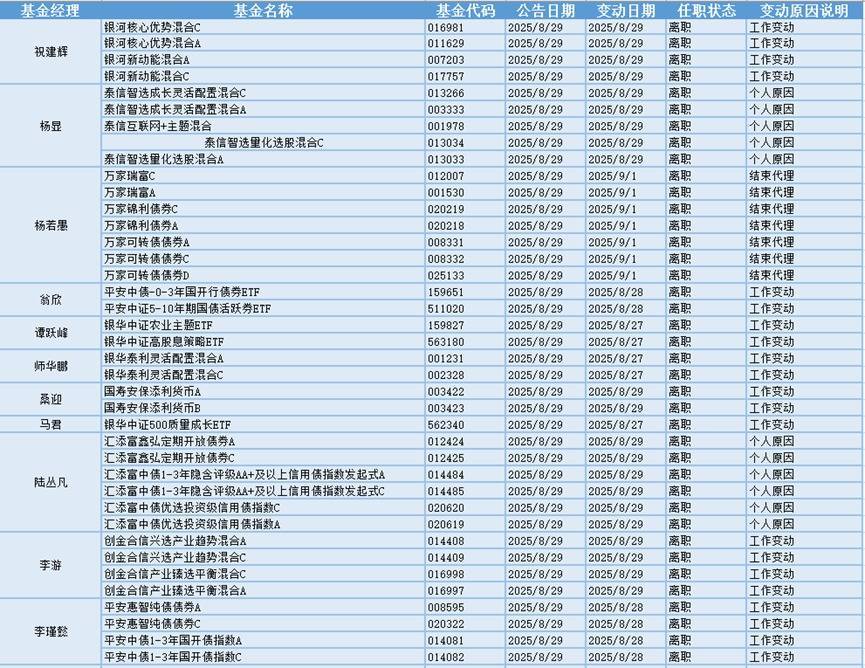 根据巨灵统计的数据显示,近30天(7.30-8.29)共有607只基金产品的基金经理发生离职变动。其中今天(8.29)有46只基金产品发布基金经理离职公告,从变动原因上来看,有12位基金经理是由于工作变动而从管理的28只基金产品中离职。有2位基金经理是由于个人原因而从管理的11只基金产品中离职。有1位基金经理是由于结束代理而从管理的7只基金产品中离职。