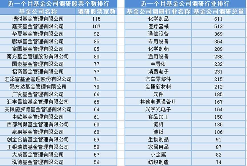 近一个月(7月30日-8月29日),博时基金参与公司调研的数量最多,共调研115家上市公司,然后调研较为活跃的还有嘉实基金、华夏基金和鹏华基金,分别调研107家、92家、85家上市公司;从调研行业上来看,基金公司对化学制品行业的上市公司调研次数最多,共有611次,其次是医疗器械行业,基金公司调研了513次。